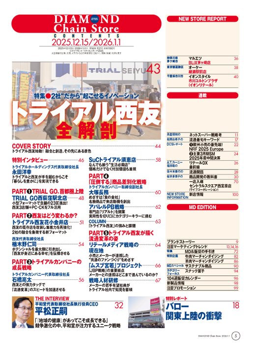 「トライアル西友」という新たな枠組みは今後、どのようなイノベーションを起こし、業界に影響や変化を与えていくのか。キーパーソンの独占インタビューに加え、2社のシナジー最大化を図る注目店舗、商品戦略、リテールDXの取り組みの最前線を追いました。
