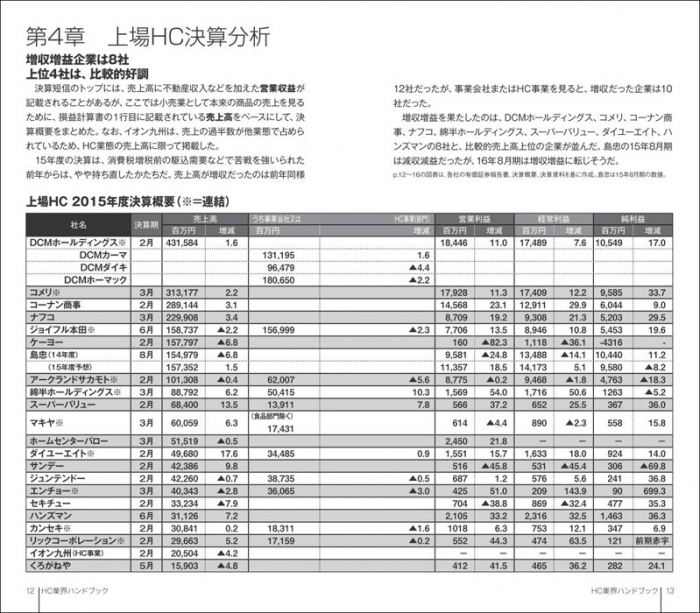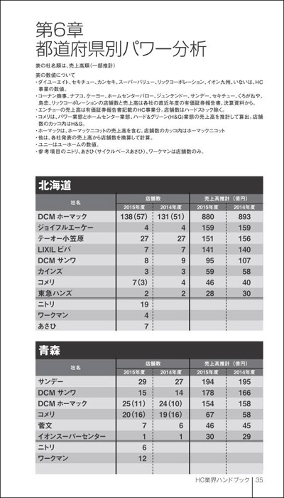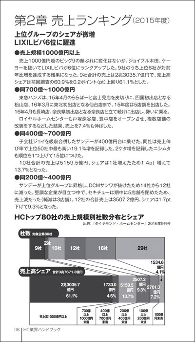 【2015年8月25日発売】ホームセンター業界唯一の専門誌が編集したビジネスの現場に必携のハンドブック。主要企業の業績や都道府県別の出店状況など、HC業界の動向をコンパクトにまとめたデータ集です。 【購読のご注意】 本書はセキュリティ保護付きPDFファイルです。画面上からのテキスト/図版の抽出、および印刷はできません。あらかじめご了承ください。 ※本書はPDF形式電子版のみでの発売です。