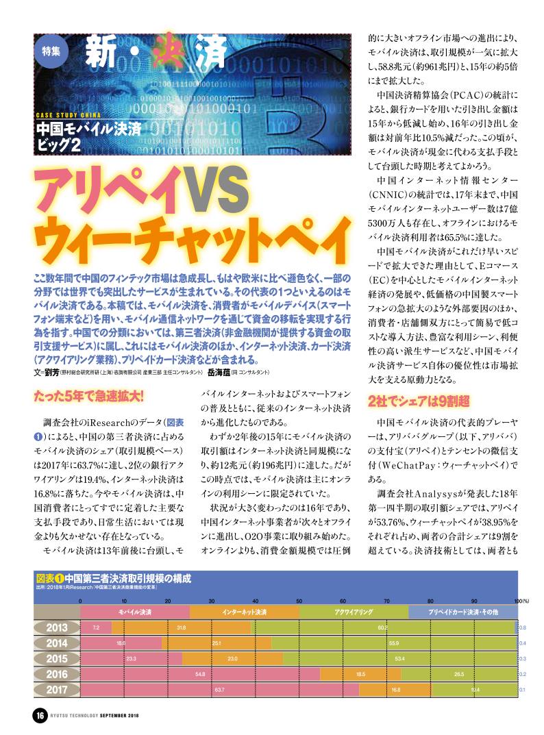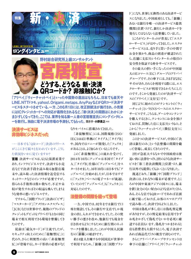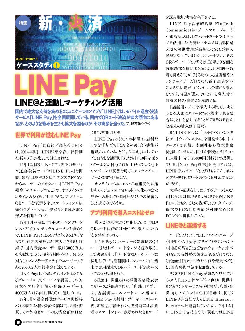 今回の特集では、こうした状況を野村総合研究所の宮居雅宣上級コンサルタントに解説してもらうとともに、日本でのQRコード決済の注目企業であるライン、楽天、NTTドコモを取材しました。さらには、QRコード決済で最先端を行く「アリペイ」と「ウィーチャットペイ」の2者対比記事を掲載しています。