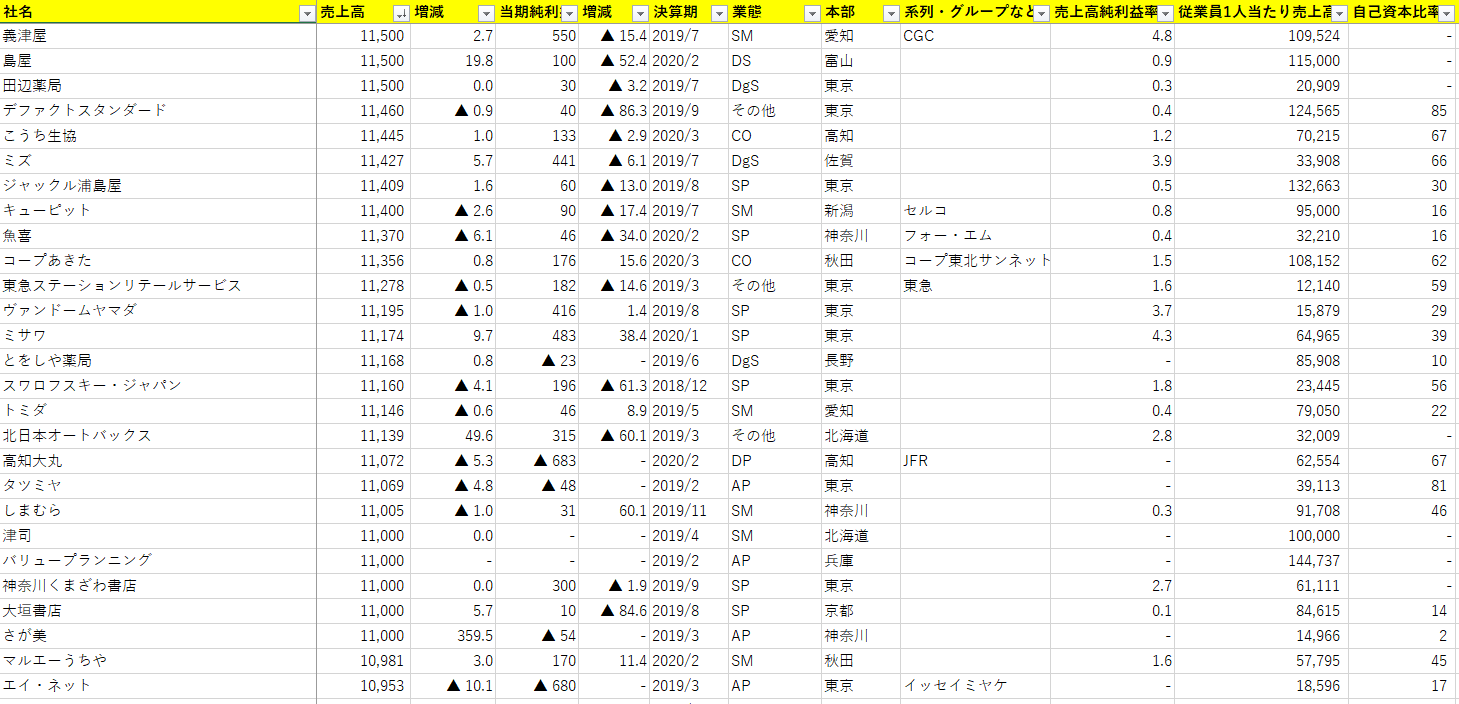 社名/売上高・対前期増減/決算期/業態/本部所在地/系列・グループ/当期純利益高・対前期増減/売上高純利益率/従業員1人当たり売上高/自己資本比率