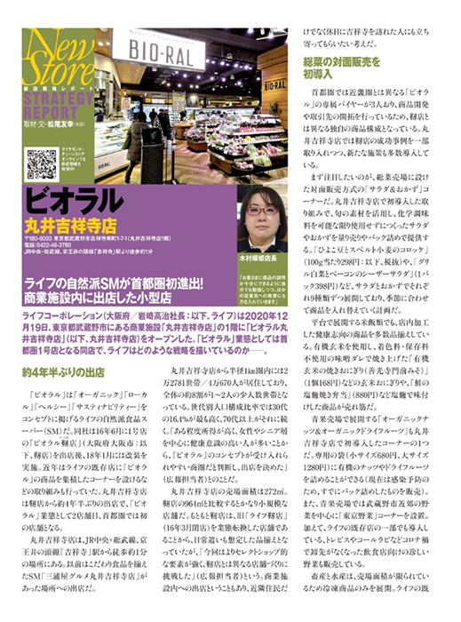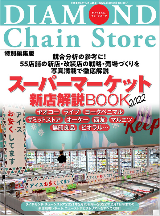 そんな昨今におすすめしたいのが、流通小売の専門誌「ダイヤモンド・チェーンストア」の特別編集版「スーパーマーケット新店解説BOOK2022」。業界関係者から多くの注目を集めた「ヤオコー和光丸山台店」「ライフグランシップ大船駅前店」のほか、「クイーンズ伊勢丹」との協業で話題となった「無印良品港南台バーズ」、ライフコーポレーションが運営する首都圏初進出のオーガニック業態「ビオラル丸井吉祥寺店」、都市型小型店舗の3号店「ヨークベニマル仙台小松島店」、アルビスの名古屋1号店となる「アルビス中村二瀬店」、年商40億円超の繁盛店を大改装した「サミットストア王子店」など、「ダイヤモンド・チェーンストア」2021年2月15日号~2022年2月1日号に収録された食品スーパー、総合スーパー、専門店、商業施設29社55店舗の新店戦略レポート、ニューストアピクトリアルをすべて収録している。