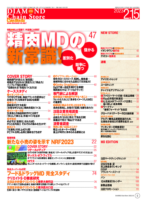 今号ではこのほか、今年1月にニューヨークで開催された全米小売業協会の年次総会「NRF2023」の現地レポートも掲載。コロナ後の小売はどう変わっていくのか――クローガーやホールフーズ・マーケットCEOの講演内容をはじめ、さまざまなセッションや展示ブースの内容をまとめました。