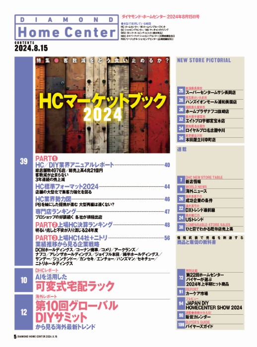『ダイヤモンド・ホームセンター2024年8月15日号』では特集「HCマーケットブック2024 客数減をどう食い止めるか」をお送りします。