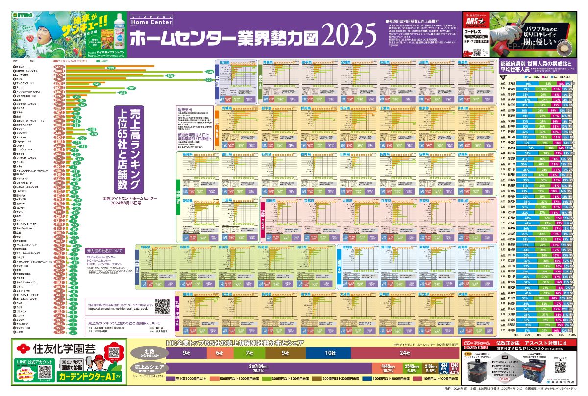 【2024年8月発売】 都道府県別の企業シェアがひと目でわかる、大型ポスターサイズのホームセンター業界の勢力図です。A面にはホームセンター業界勢力図、B面にはホームセンター用販促カレンダーを掲載。オフィスに必掲のビジュアルデータ集に仕上げました。